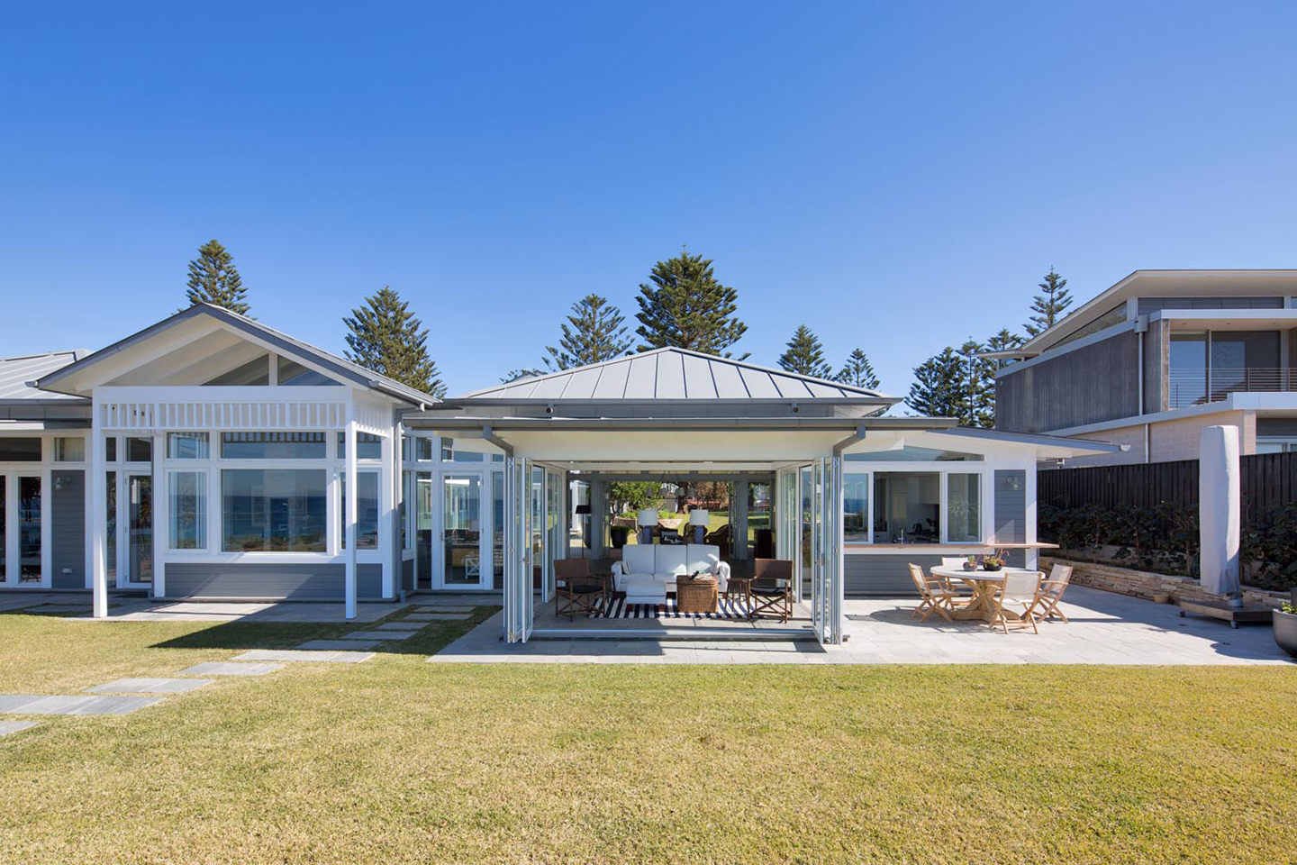 An HIA-Award winning second-generation rebuild of a beach home, featuring a post and beam pavilion.
