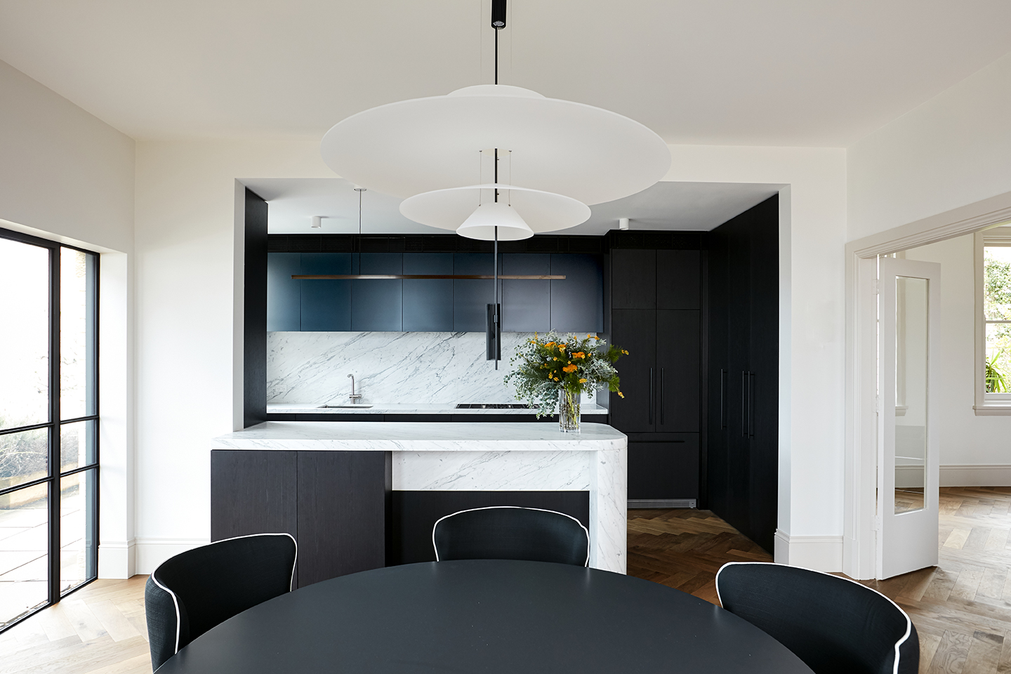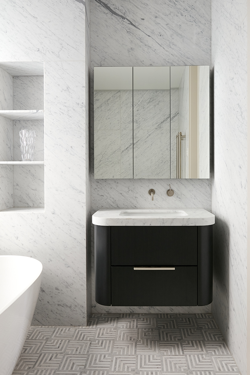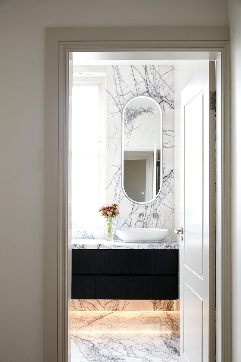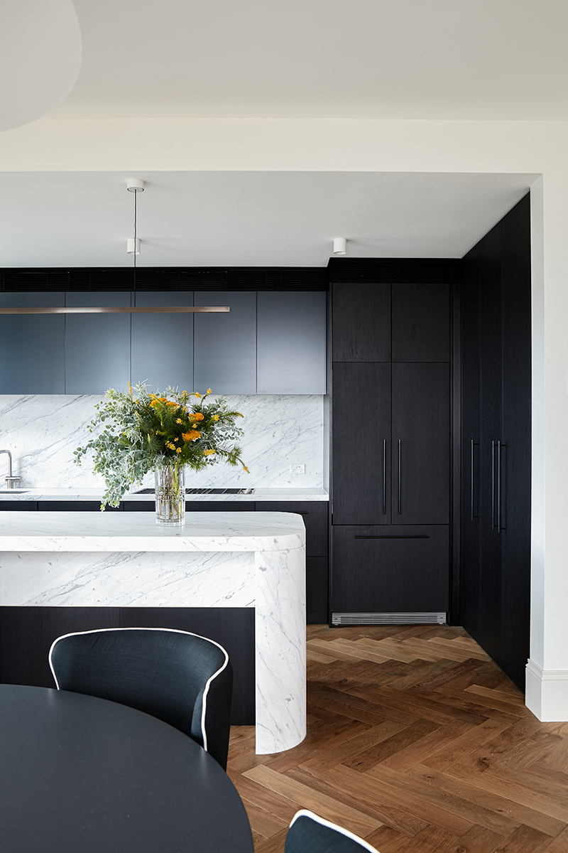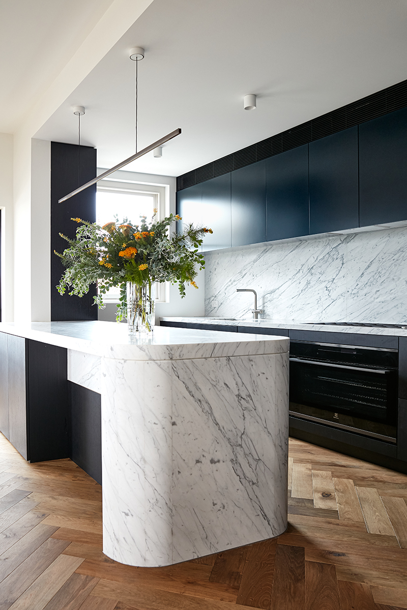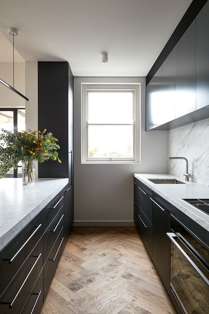 This penthouse renovation delivers a refined balance between heritage charm and contemporary sophistication. The reconfigured layout maximises light and space, particularly in the kitchen, where custom timber veneer cabinetry, a statement marble benchtop, and a feature pendant light create a warm yet elegant focal point.